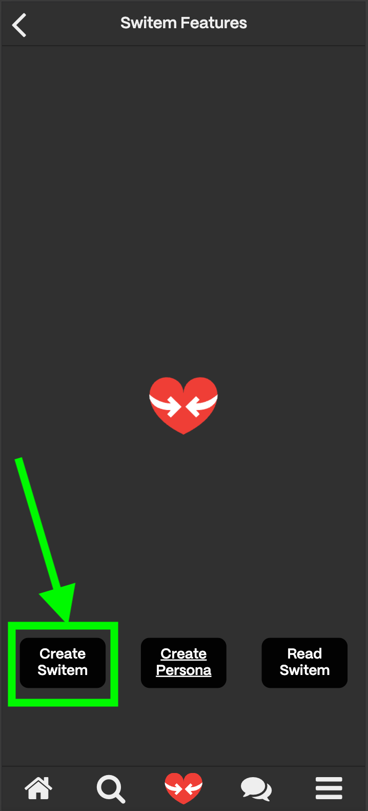 Interaction with Switems can be done through clicking the red heart on mobile devices. This brings up the Switem Features page. You are presented with 4 buttons.- The first button is an animated red heart in the middle of the screen. This is an NFC Quick-Read button. When you activate this feature you get the option to scan a switem to get to its Hub. You do not rotate the keys when you access the information in this manner.